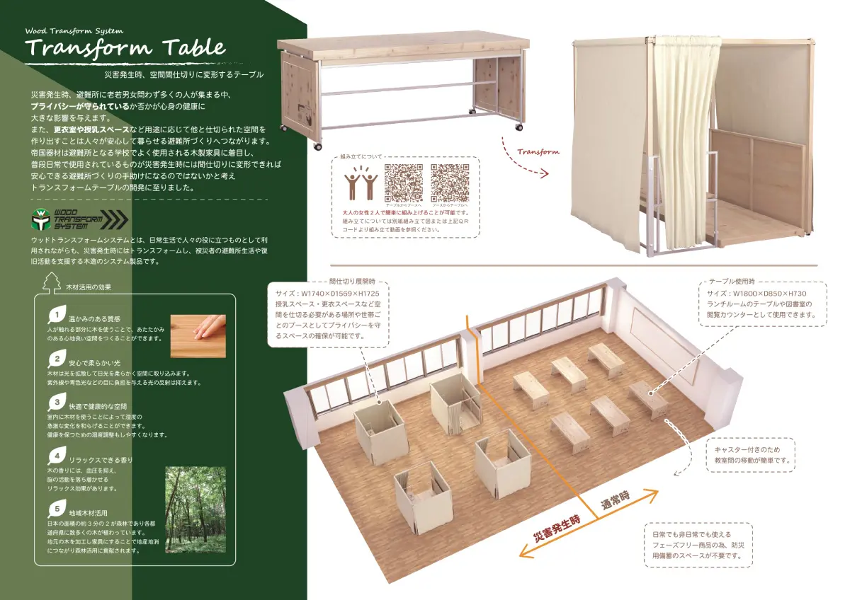 日常的に使うテーブルを、非常時にトランスフォームして避難所のブースに展開できる「Transform Table」を開発、リリースいたしました。